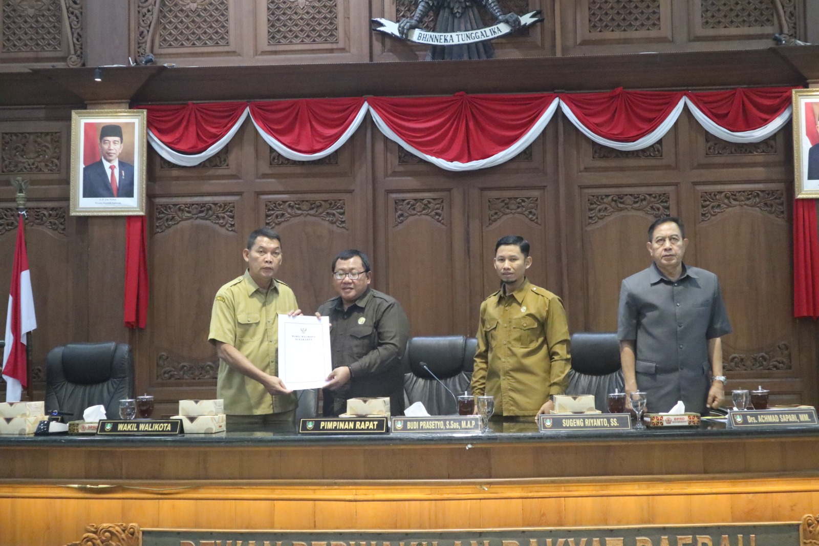 HUMAS DPRD KOTA SURKARTA – Wali Kota Surakarta menyampaikan nota jawaban atas pandangan umum fraksi DPRD Kota Surakarta terhadap dua rancangan peraturan daerah (raperda) yang diluncurkan Pemkot Surakarta